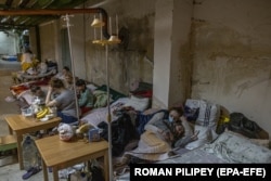 დედები შვილებთან ერთად თავს აფარებენ ბავშვთა საავადმყოფოს სარდაფს. კიევი. 1 მარტი.