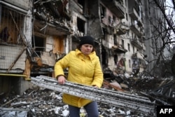ქალი ცდილობს ნაგვის გატანას საცხოვრებელი კორპუსიდან, რომელსაც, სავარაუდოდ, ჭურვი მოხვდა. კიევი. 25 თებერვალი.