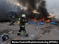 მეხანძრეები აქრობენ დაბომბვით გამოწვეულ ხანძარს. ჩუგუივი. 24 თებერვალი.