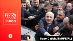 ვანო მერაბიშვილი ჟურნალისტების „ალყაში“ საპატიმროს დატოვების შემდეგ.