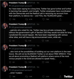 ამას მოჰყვა ტრამპის ახალი პოსტი ტვიტერში, ახლა უკვე აშშ-ის პრეზიდენტის ოფიციალურ გვერდზე დაწერილი, სადაც ამბობს, რომ სოციალური მედიის საკუთარი პლატფორმის შექმნას განიხილავს, თუმცა მოგვიანებით ეს პოსტიც წაიშალა.