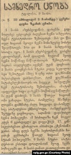 „1920 წლის მაისის 7-ს, ღამის 12 საათსა და 20 წუთზე, საქართველოს წარმომადგენელმა, დამფუძნებელი კრების წევრმა გრიგოლ ურატაძემ ხელი მოაწერა საზავო ხელშეკრულებას რუსეთსა და საქართველოს შორის“, - ეს ისტორიული ცნობა, ხელშეკრულების ძირითად მუხლებთან ერთად, 1920 წლის 11 მაისის „საქართველოს რესპუბლიკაში“ გამოქვეყნდა.