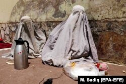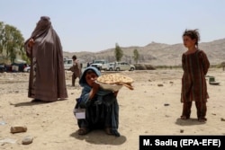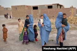 ქალი ბურკაში ბავშვებთან ერთად 4 აგვისტოს, ყანდაარში, იმ დროისთვის ქალაქში ერთმანეთს ავღანეთის სამთავრობო ძალები და თალიბები ებრძოდნენ.