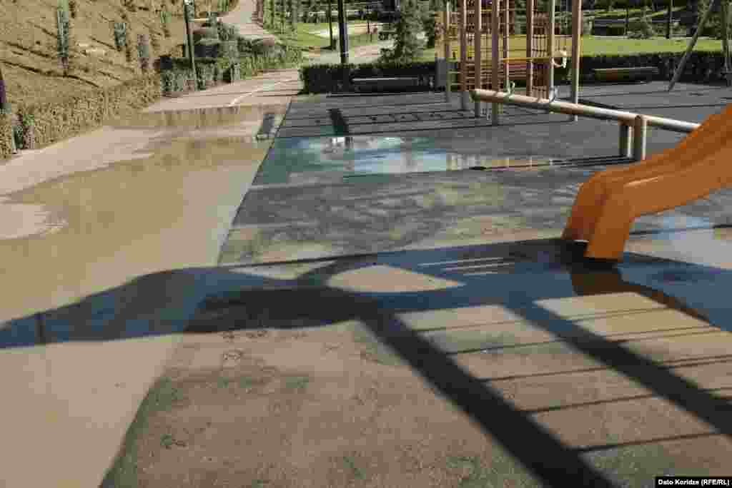 ალაგ-ალაგ წყალი დგება, მათ შორის სათამაშო მოედანზეც.